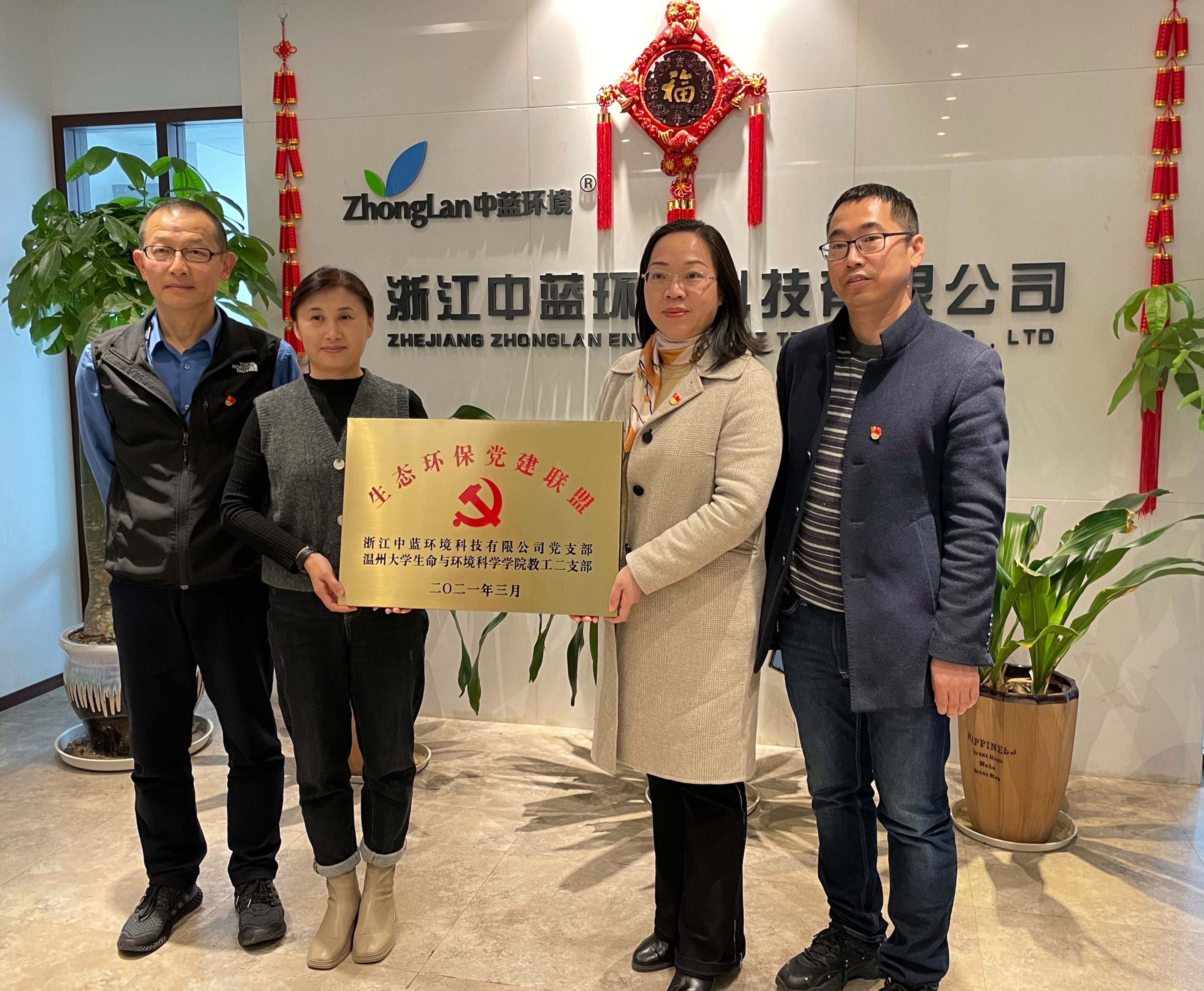 2022年3月3日,溫州大學生命與環境科學學院教工二支部和浙江中藍環境科技有限公司黨支部舉行“生態環保·黨建聯盟”掛牌儀式。溫州大學生命與環境科學學院黨委書記姜海燕、學院教工二支部書記王奇同浙江中藍環境科技有限公司黨支部書記胡長敏就黨建共建共享、黨建引領交流合作等相關事宜進行了深入探討。